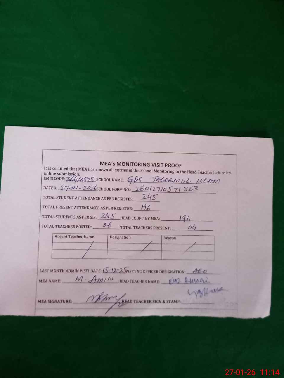 | Attendance Register | Head Teacher | MEA with School | Visit Proof |