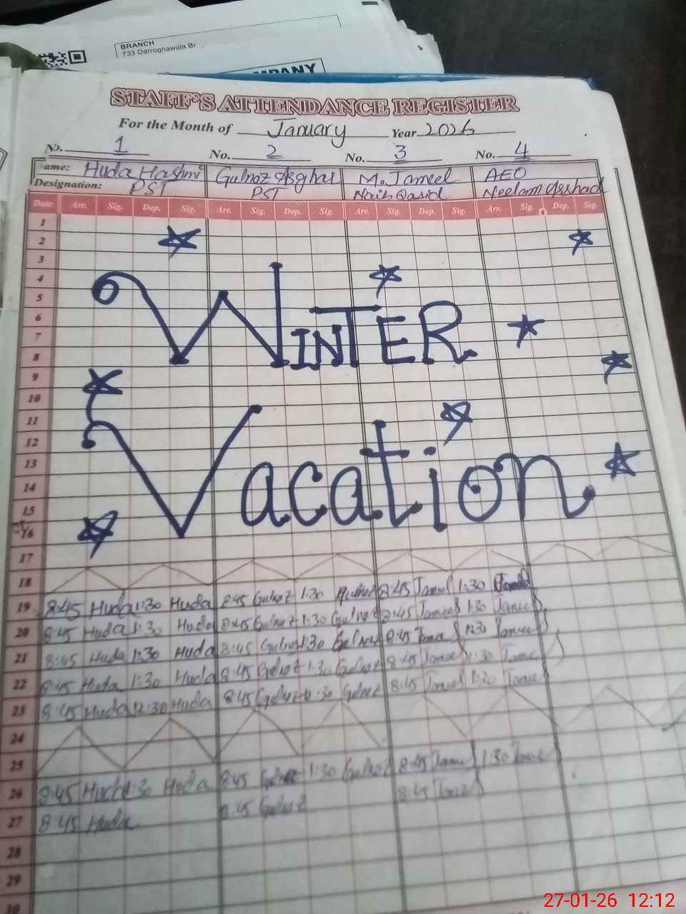 | CNIC | Full Name | Designation | R/C | Absence During Last Calender Month |
