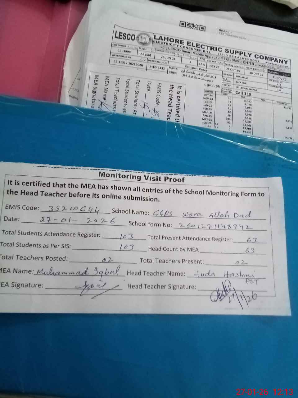 | Attendance Register | Head Teacher | MEA with School | Visit Proof |