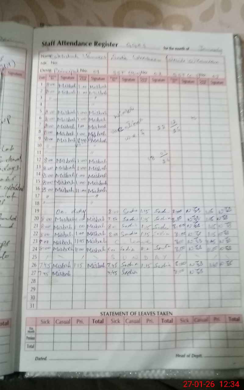 | CNIC | Full Name | Designation | R/C | Absence During Last Calender Month |