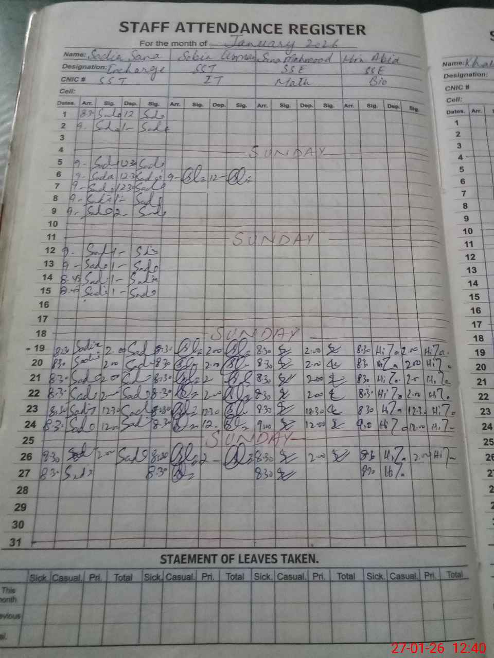 | CNIC | Full Name | Designation | R/C | Absence During Last Calender Month |