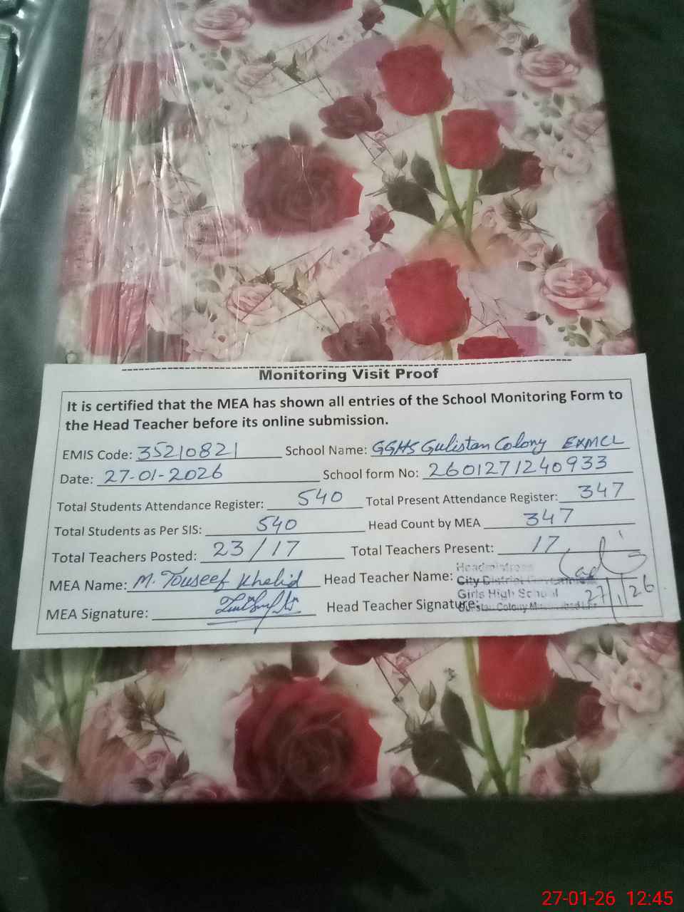 | Attendance Register | Head Teacher | MEA with School | Visit Proof |