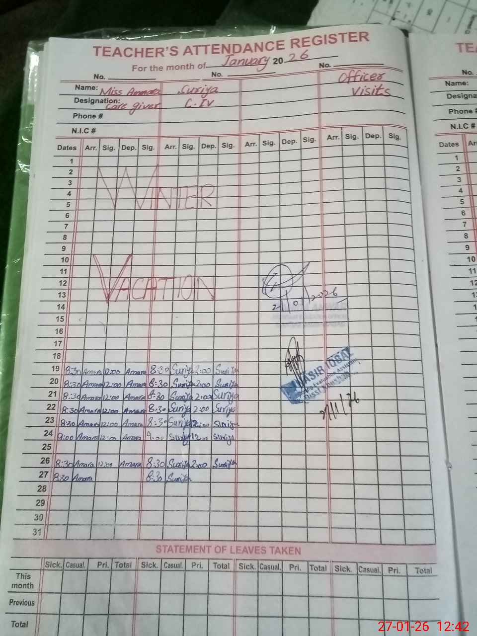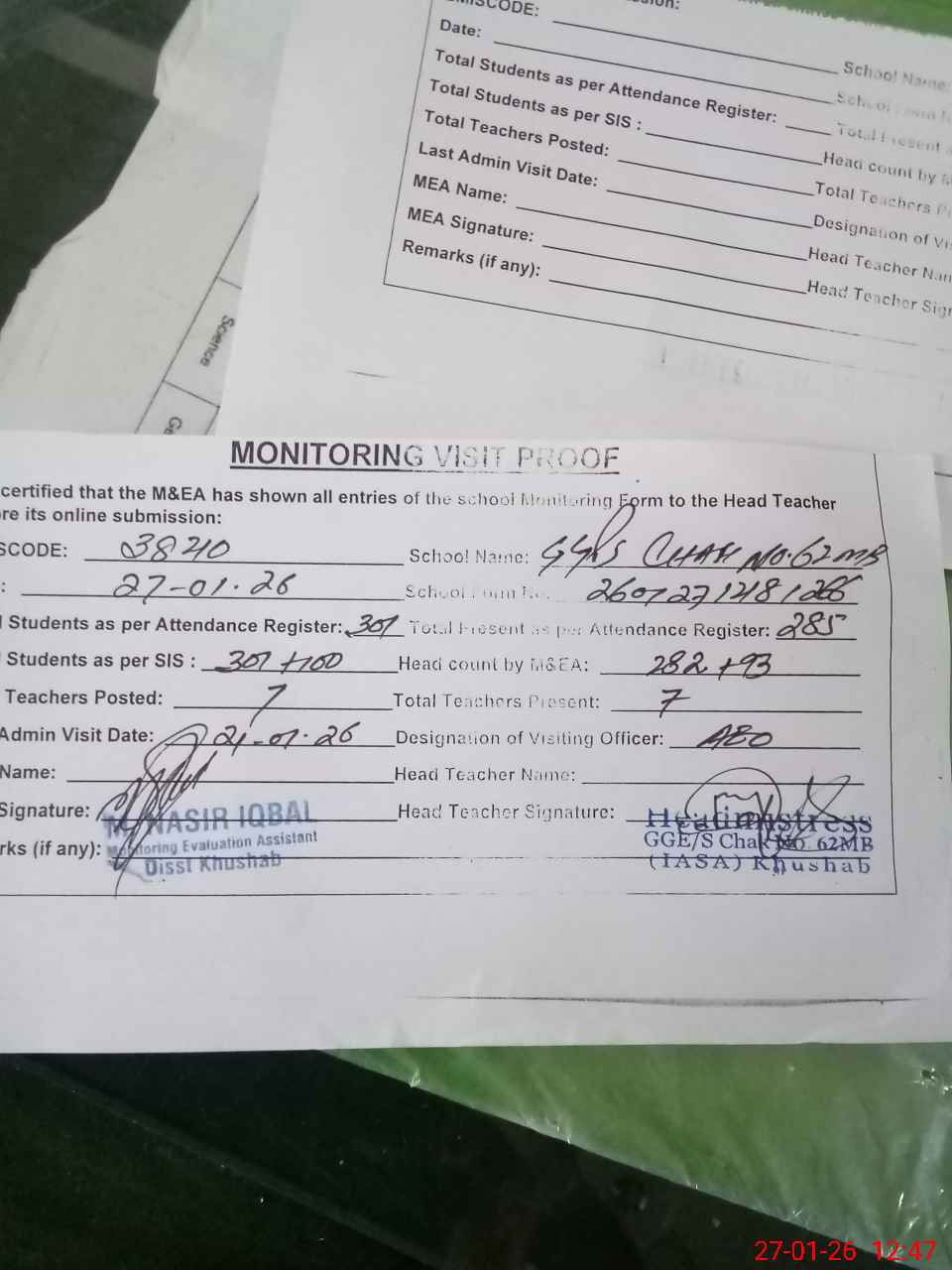 | Attendance Register | Head Teacher | MEA with School | Visit Proof |