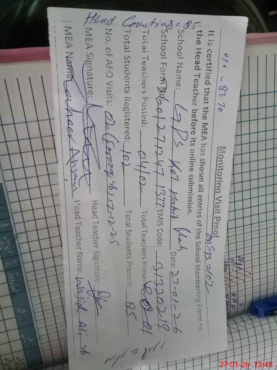 | Attendance Register | Head Teacher | MEA with School | Visit Proof |