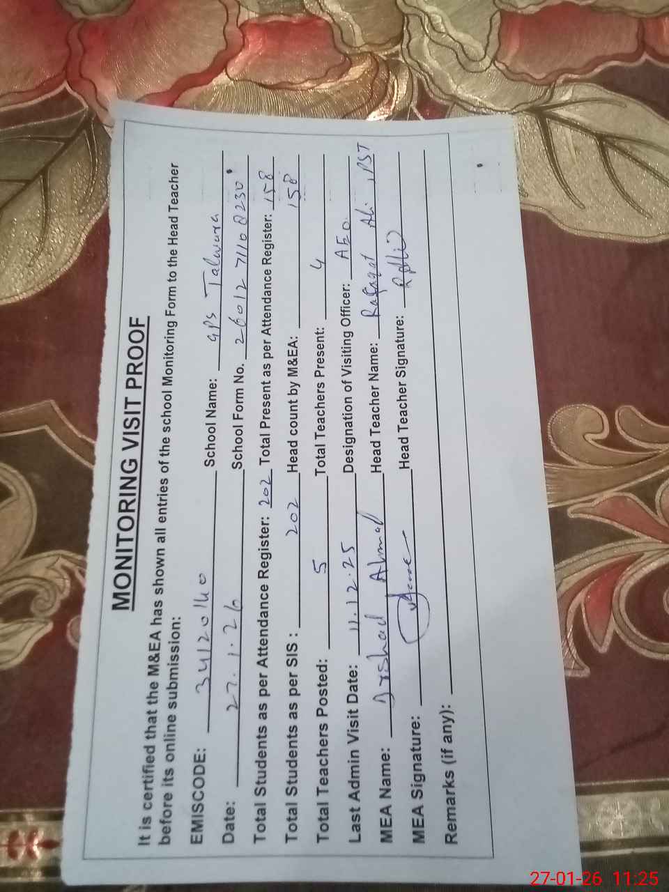 | Attendance Register | Head Teacher | MEA with School | Visit Proof |
