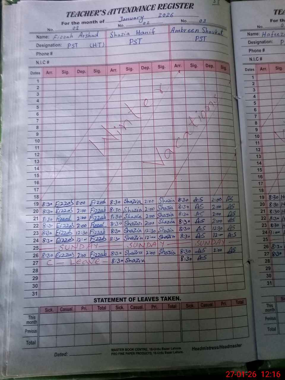 | Leave | Duty | Absent | Maternity | Medical | Ex- Pak |