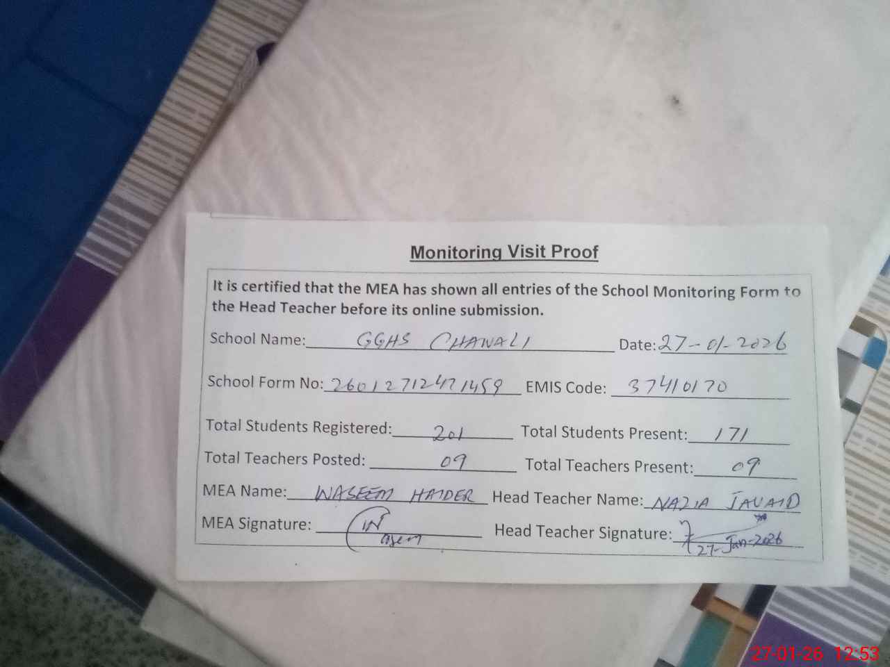 | Attendance Register | Head Teacher | MEA with School | Visit Proof |