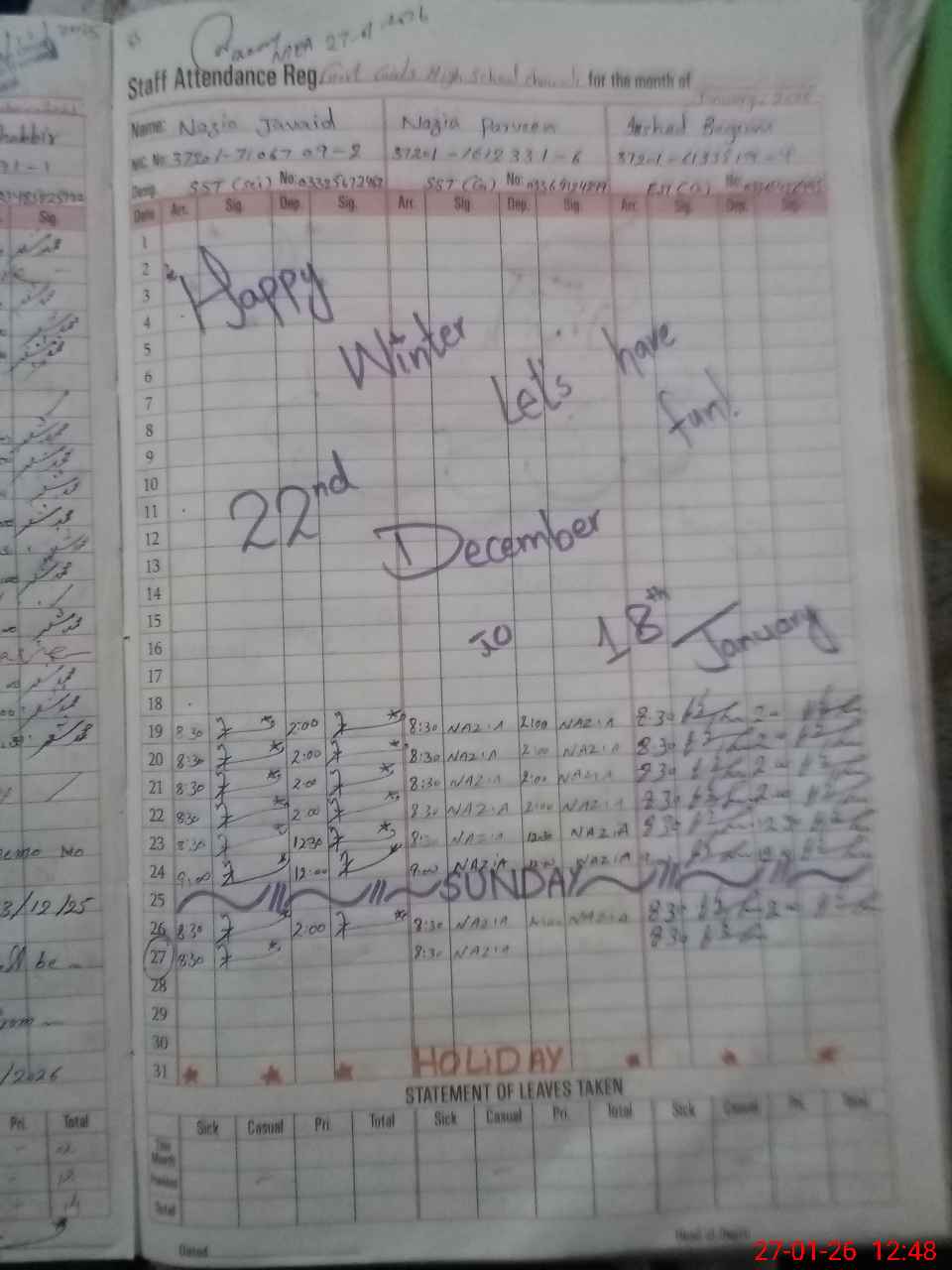 | CNIC | Full Name | Designation | R/C | Absence During Last Calender Month |