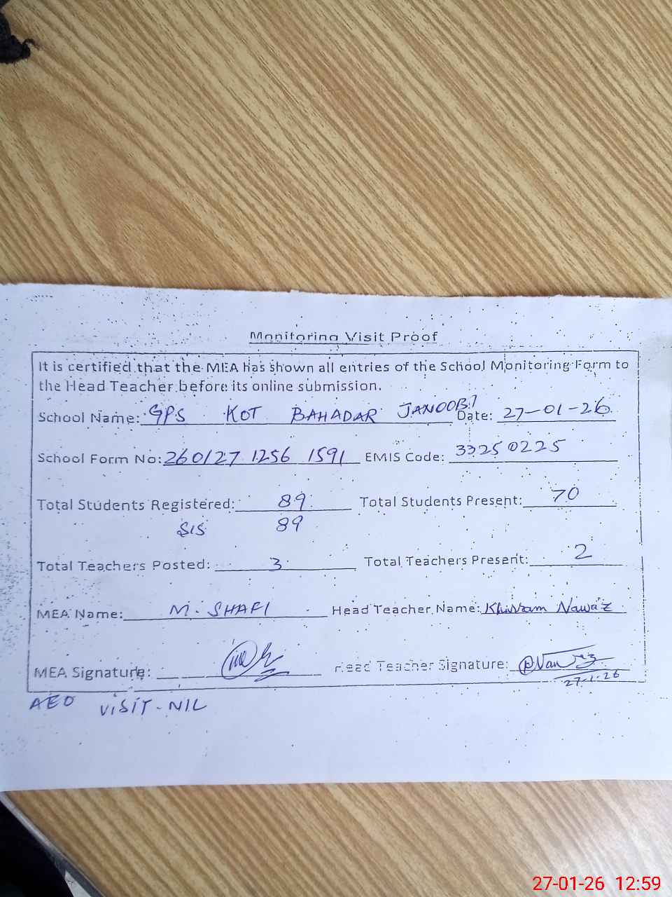 | Attendance Register | Head Teacher | MEA with School | Visit Proof |