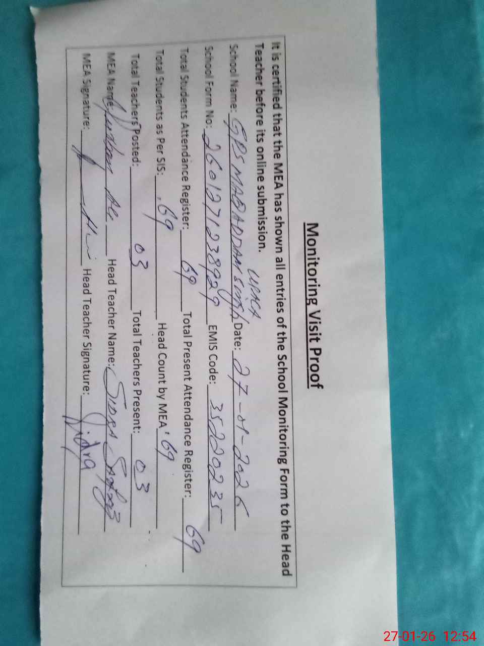 | Attendance Register | Head Teacher | MEA with School | Visit Proof |