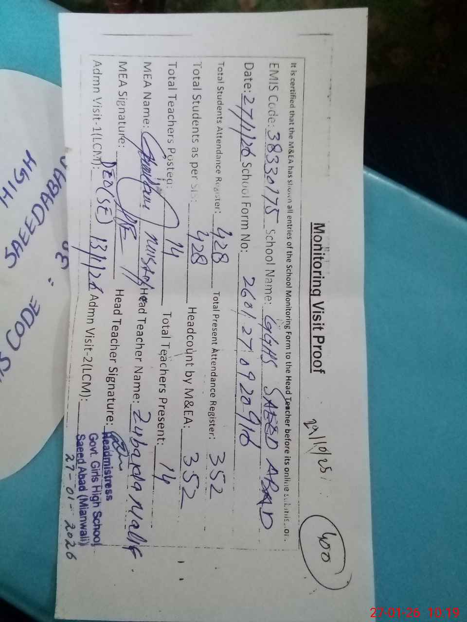 | EMIS Code: 38330175 | Name of School: GGHS SAEED ABAD | |||