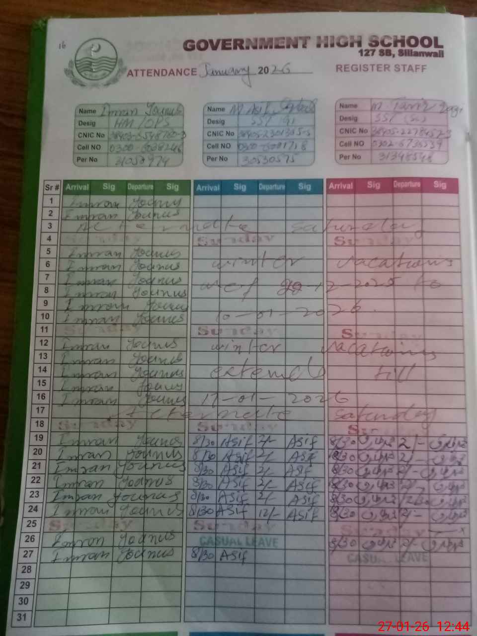 | CNIC | Full Name | Designation | R/C | Absence during last cal. month |