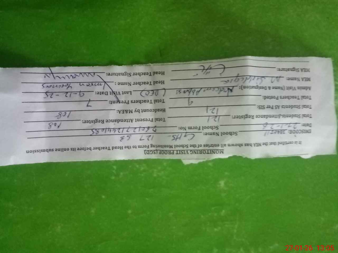 | Attendance Register | Head Teacher | MEA with School | Visit Proof |