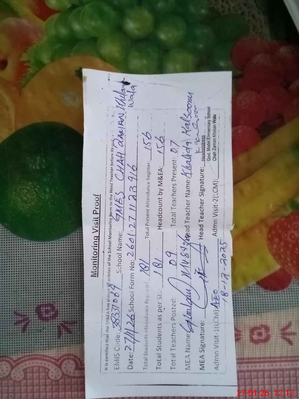 | Attendance Register | Head Teacher | MEA with School | Visit Proof |