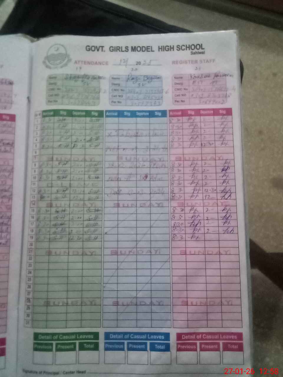 | CNIC | Full Name | Designation | R/C | Absence during last cal. month |