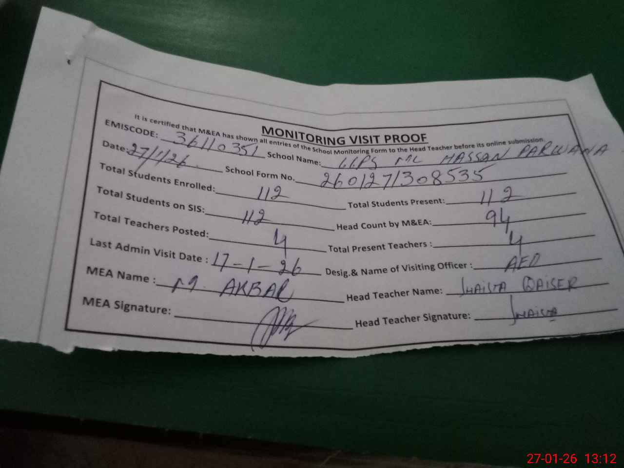 | Attendance Register | Head Teacher | MEA with School | Visit Proof |