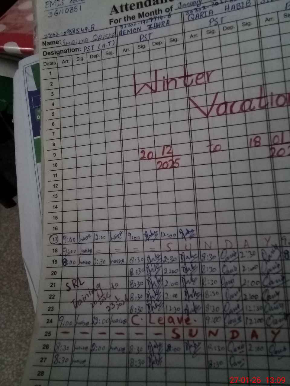 | CNIC | Full Name | Designation | R/C | Absence During Last Calender Month |