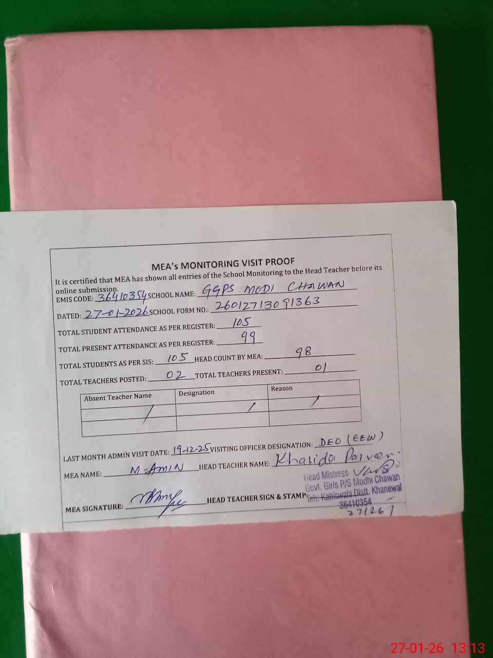 | Attendance Register | Head Teacher | MEA with School | Visit Proof |