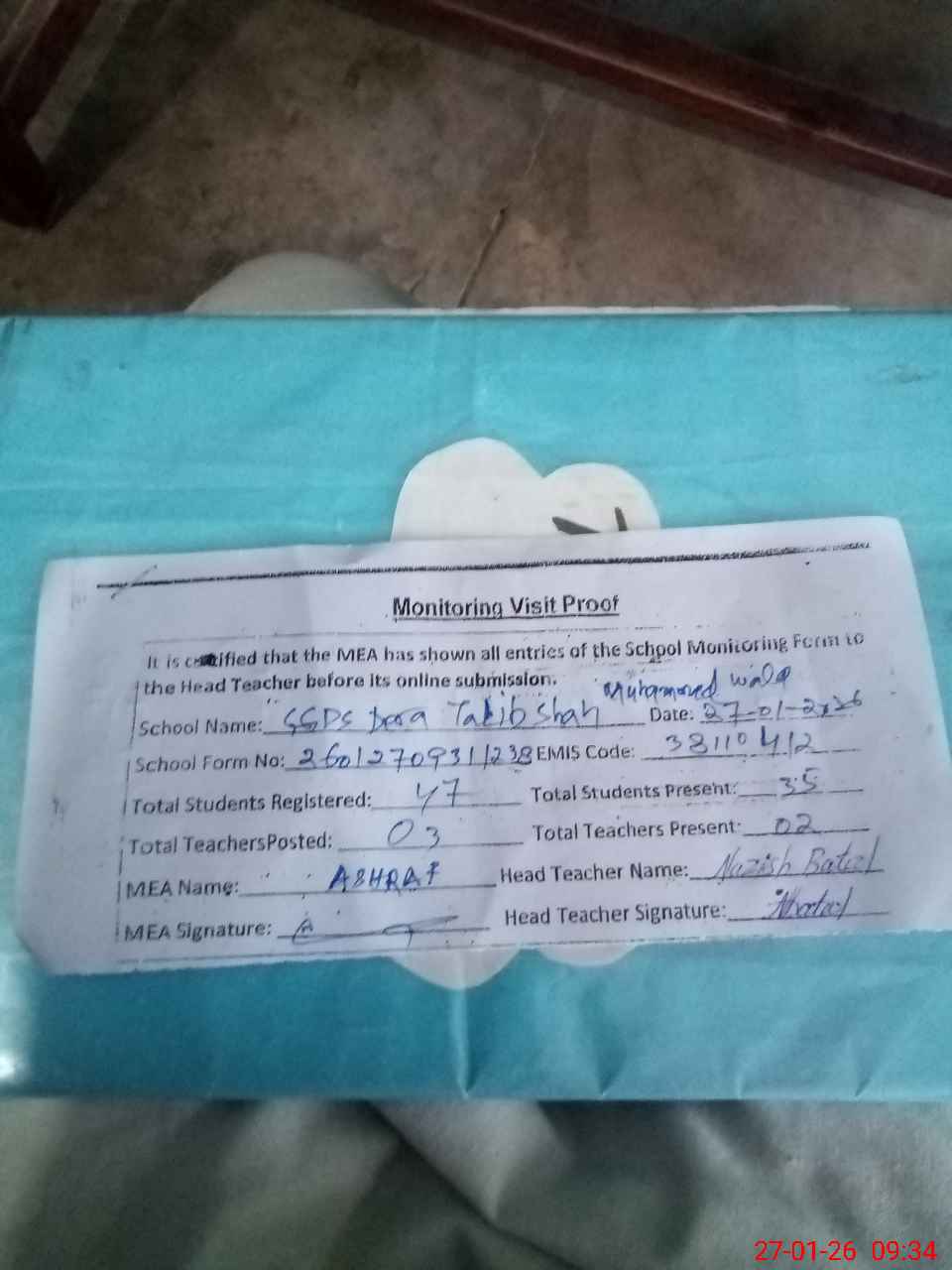 | Attendance Register | Head Teacher | MEA with School | Visit Proof |