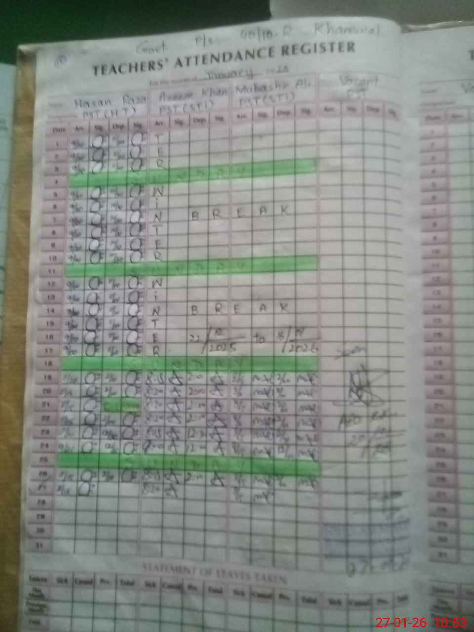 | Leave | Duty | Absent | Maternity | Medical | Ex- Pak |