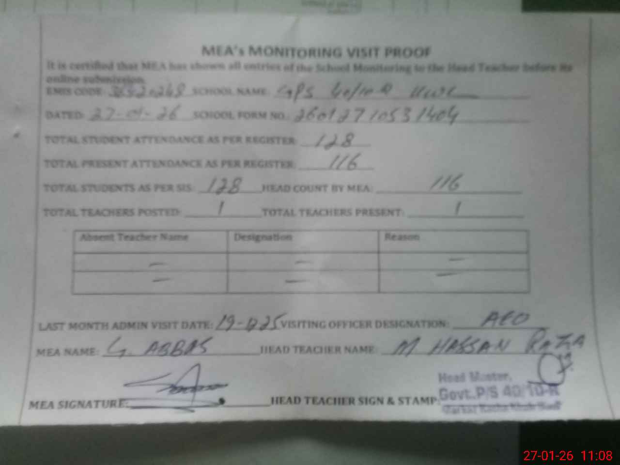 | Attendance Register | Head Teacher | MEA with School | Visit Proof |