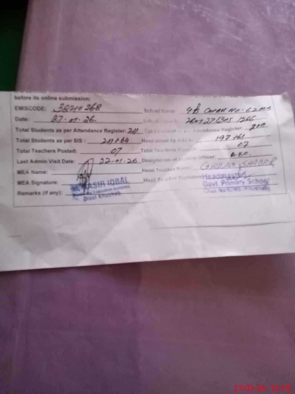 | EMIS Code: 38210268 | Name of School: GPS CHAK NO 62 MB | |||