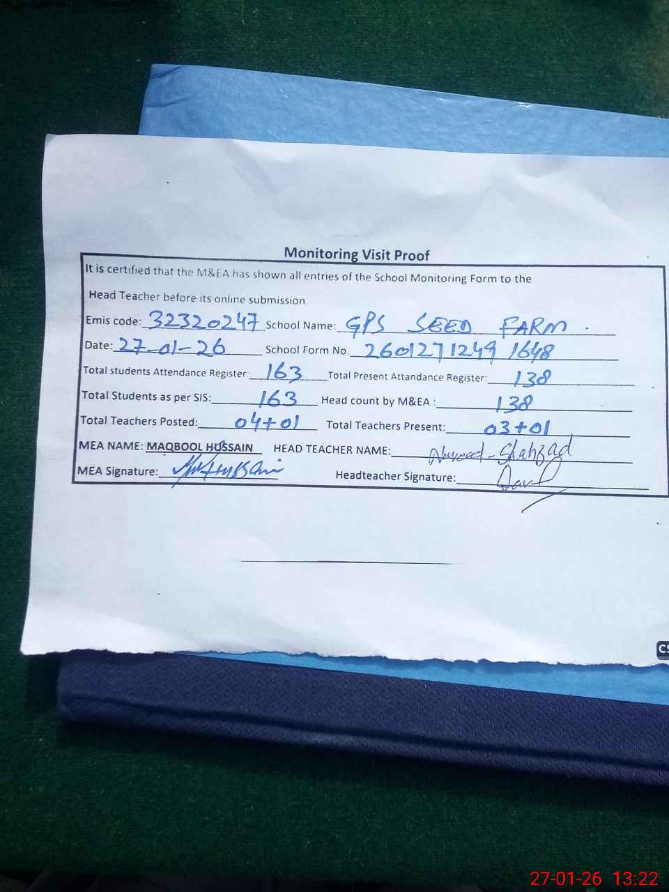 | Attendance Register | Head Teacher | MEA with School | Visit Proof |