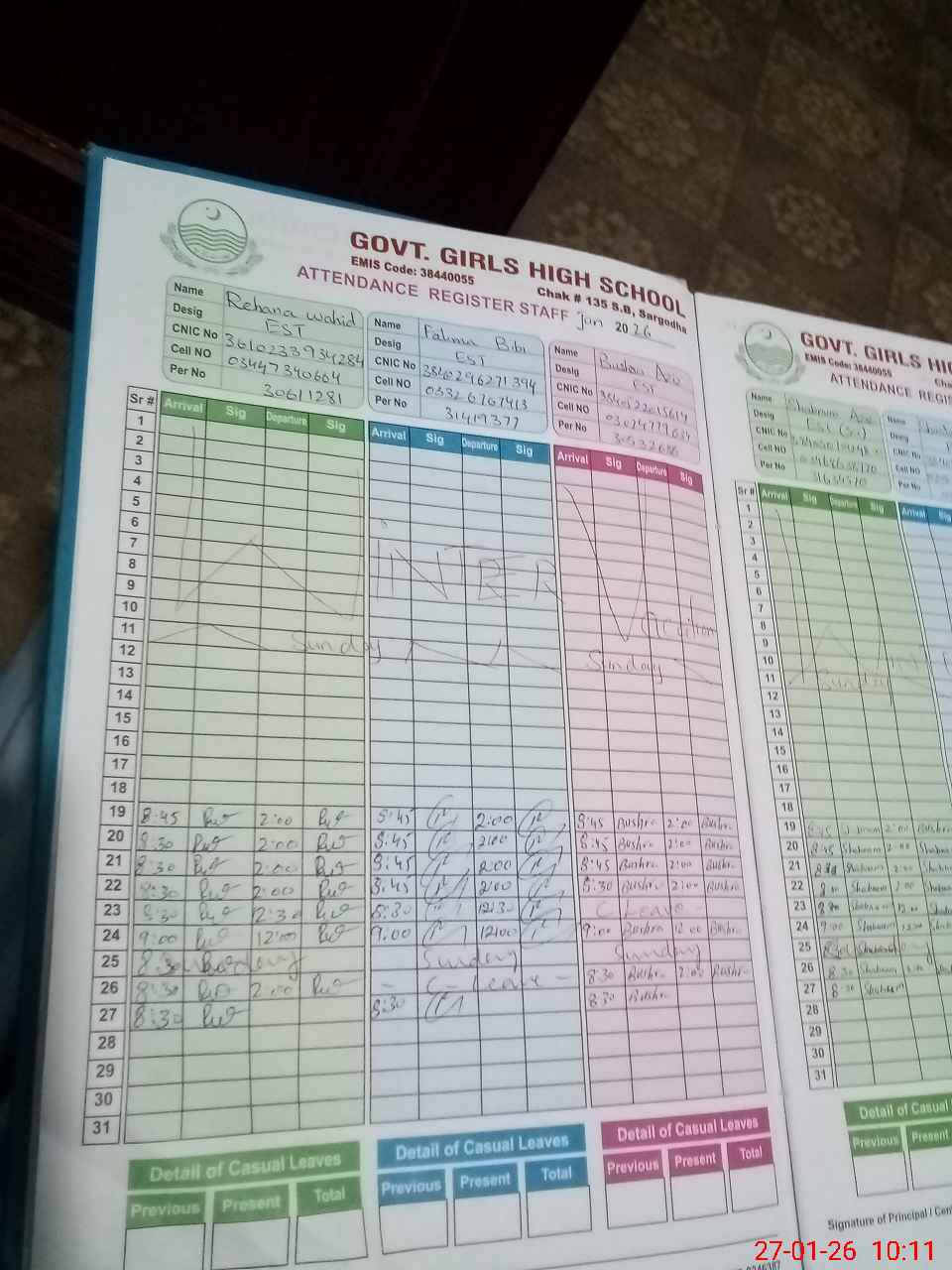 | CNIC | Full Name | Designation | R/C | Absence During Last Calender Month |