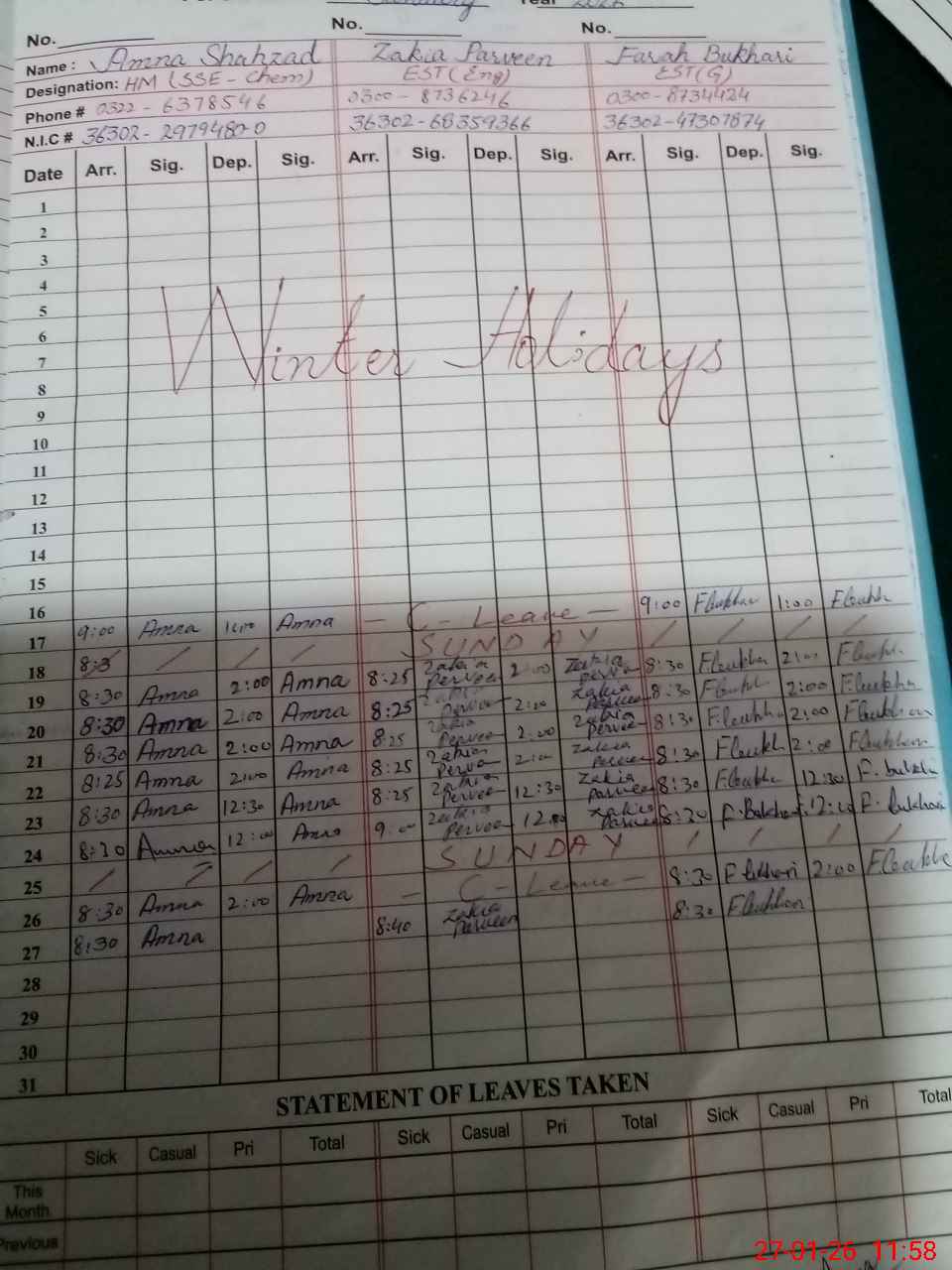 | CNIC | Full Name | Designation | R/C | Absence During Last Calender Month |