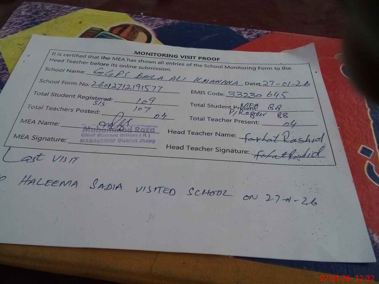 | Attendance Register | Head Teacher | MEA with School | Visit Proof |