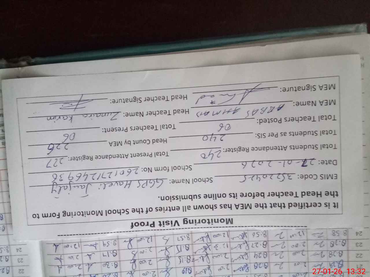 | Attendance Register | Head Teacher | MEA with School | Visit Proof |