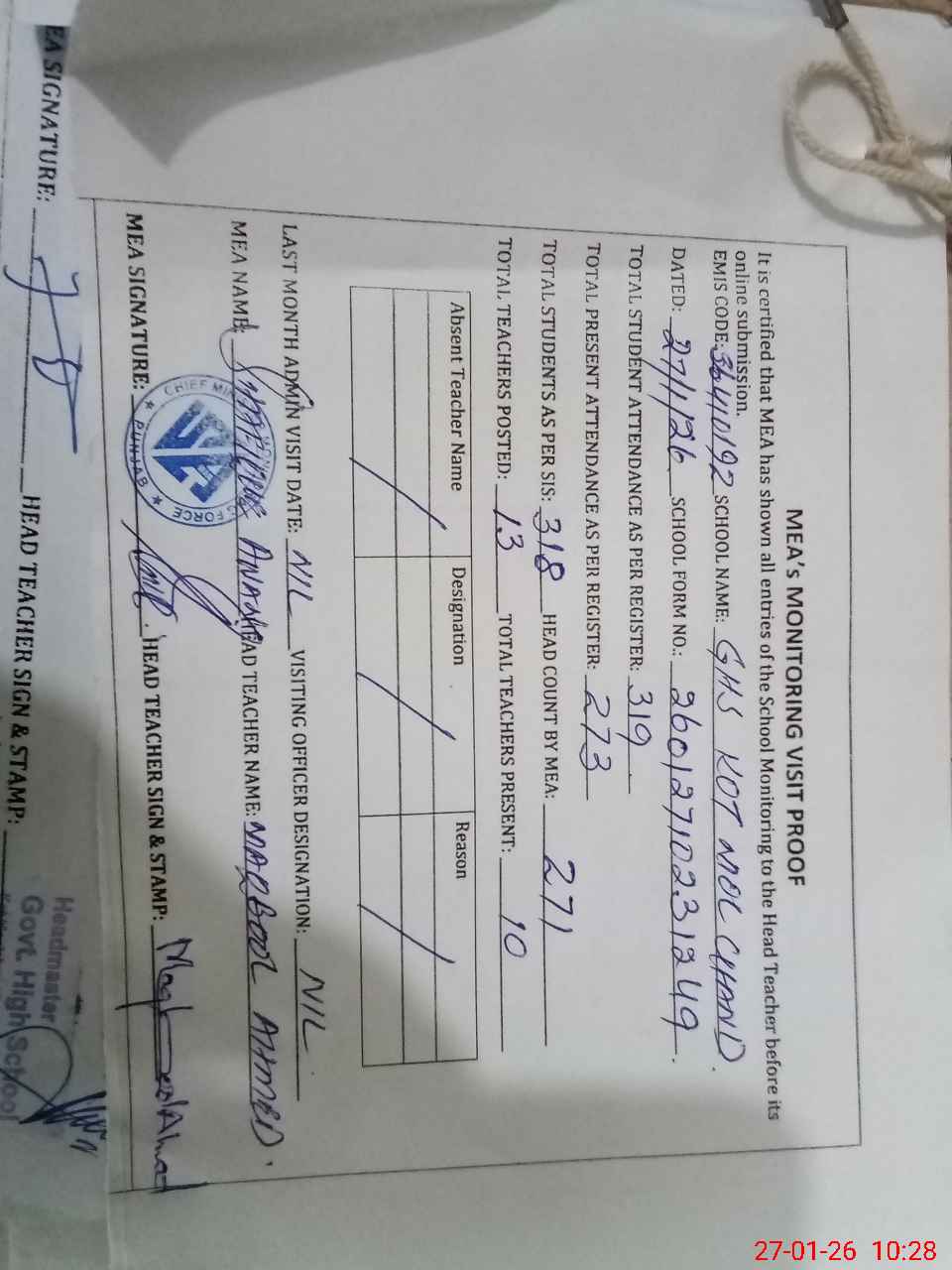 | EMIS Code: 36410192 | Name of School: GHS KOT MULCHAND, KABIRWALA | |||