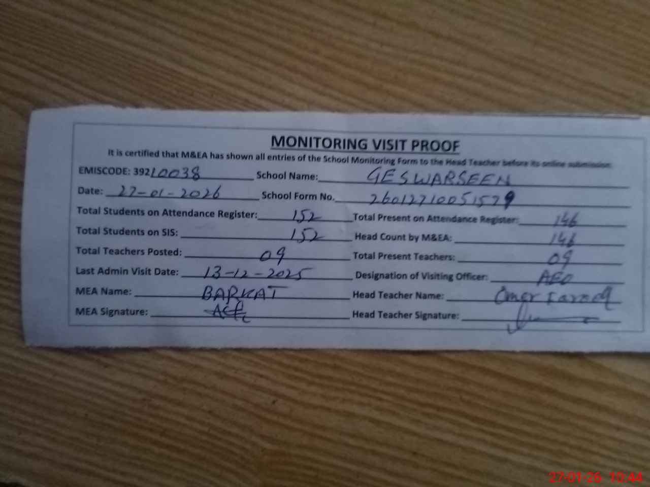 | Attendance Register | Head Teacher | MEA with School | Visit Proof |