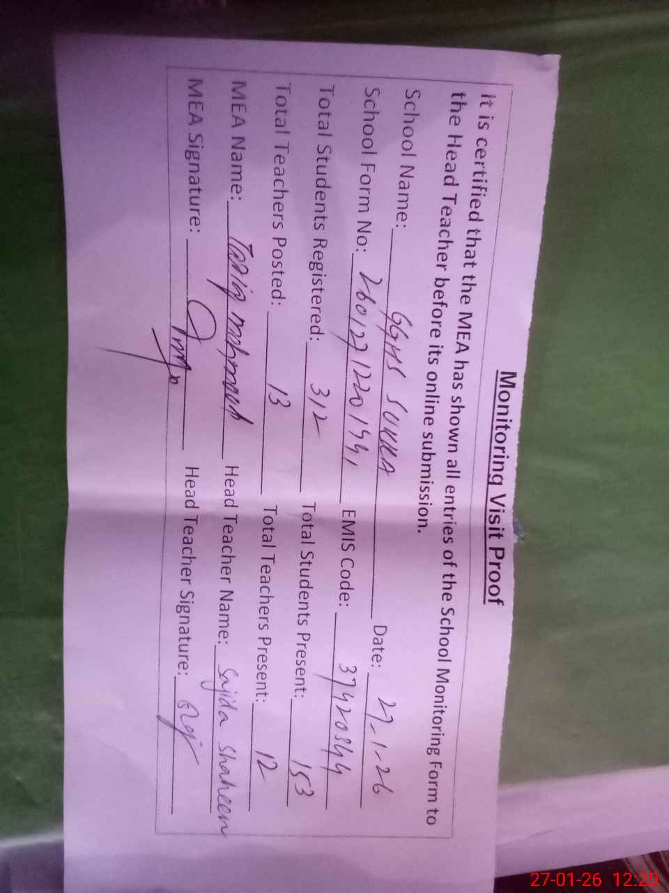 | Attendance Register | Head Teacher | MEA with School | Visit Proof |