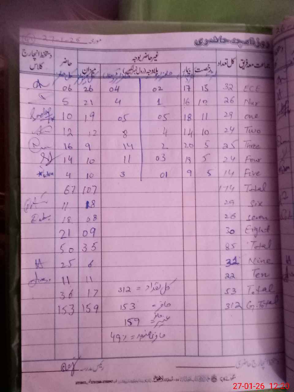 | Total Students Present | 0 | 6 | 10 | 12 | 16 | 14 | 4 | 11 | 18 | 21 | 25 | 11 | 153 | |||