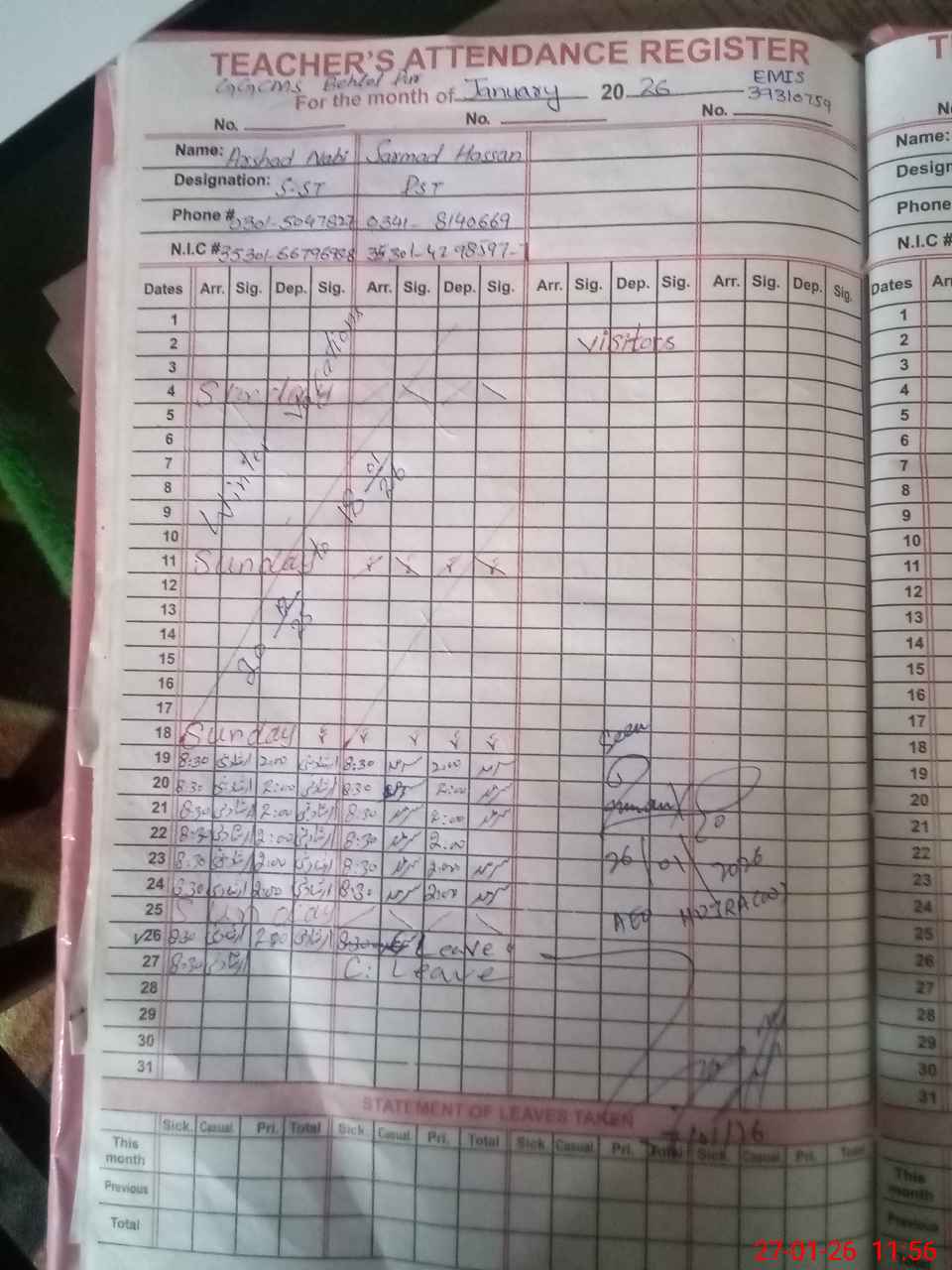 | CNIC | Full Name | Designation | R/C | Absence During Last Calender Month |