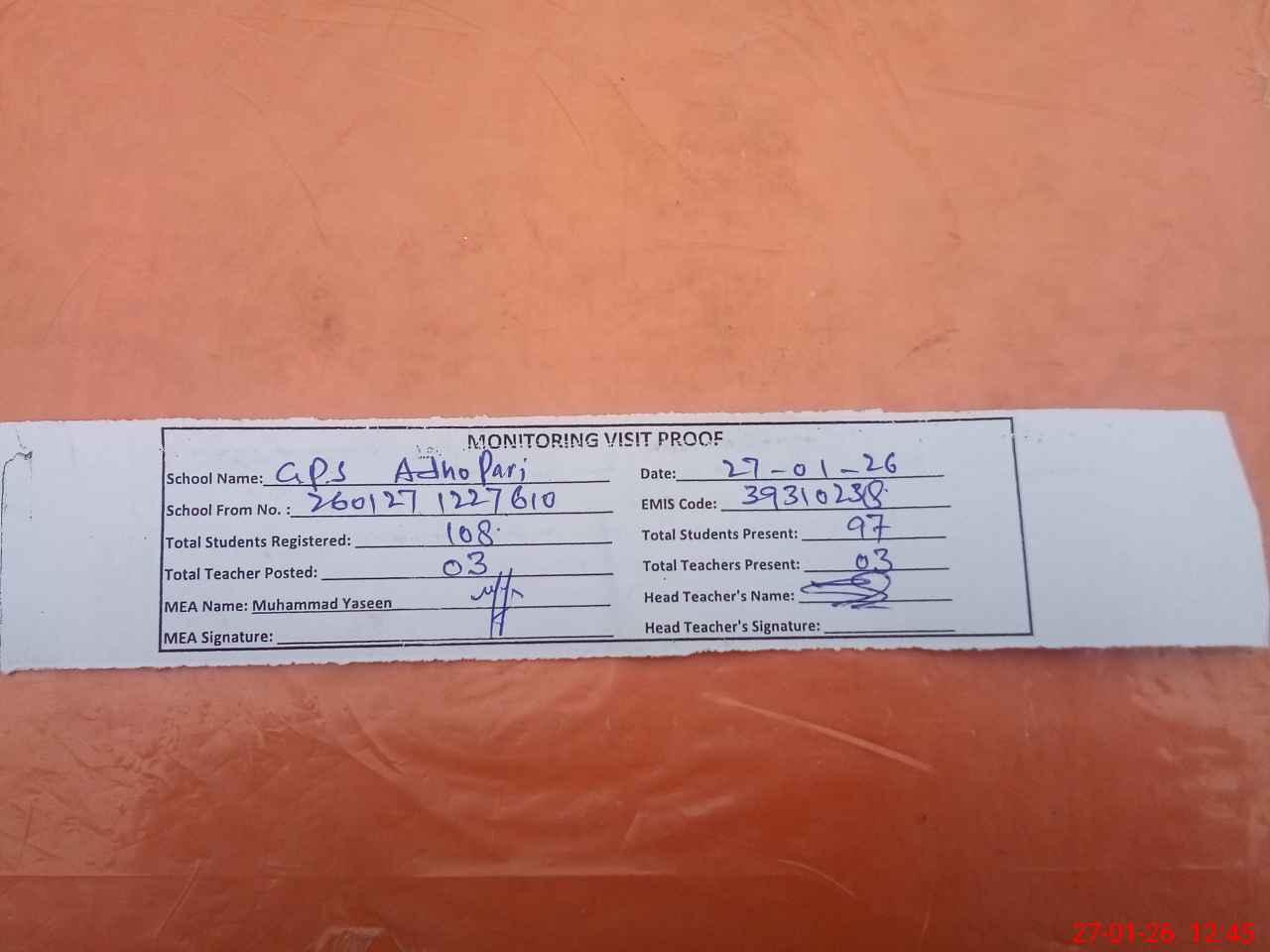| EMIS Code: 39310238 | Name of School: GPS ADHO PARI | |||