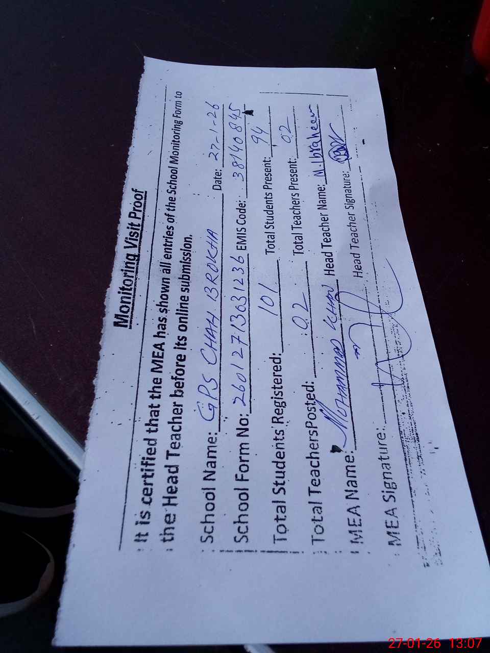 | Attendance Register | Head Teacher | MEA with School | Visit Proof |