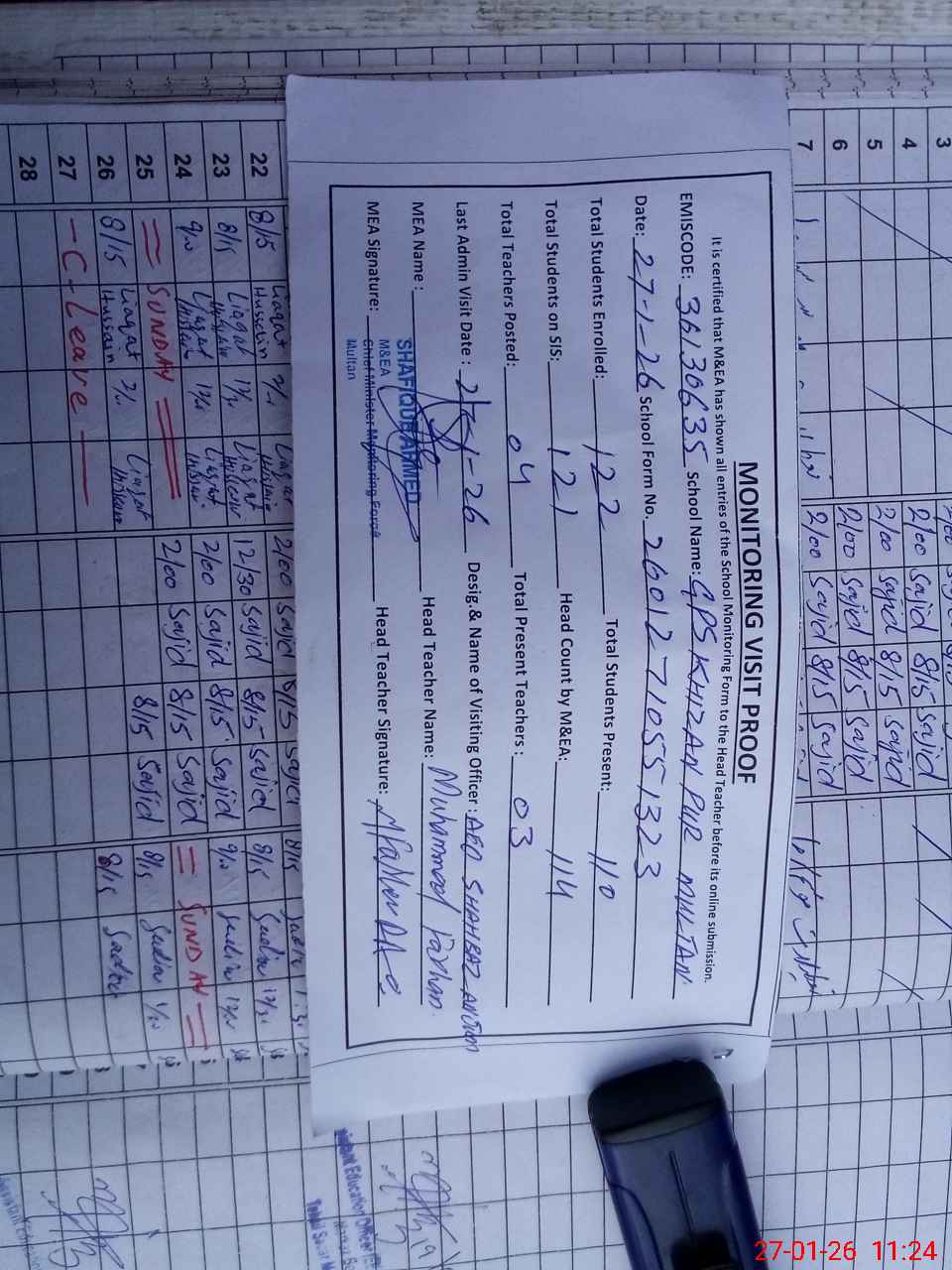 | Attendance Register | Head Teacher | MEA with School | Visit Proof |