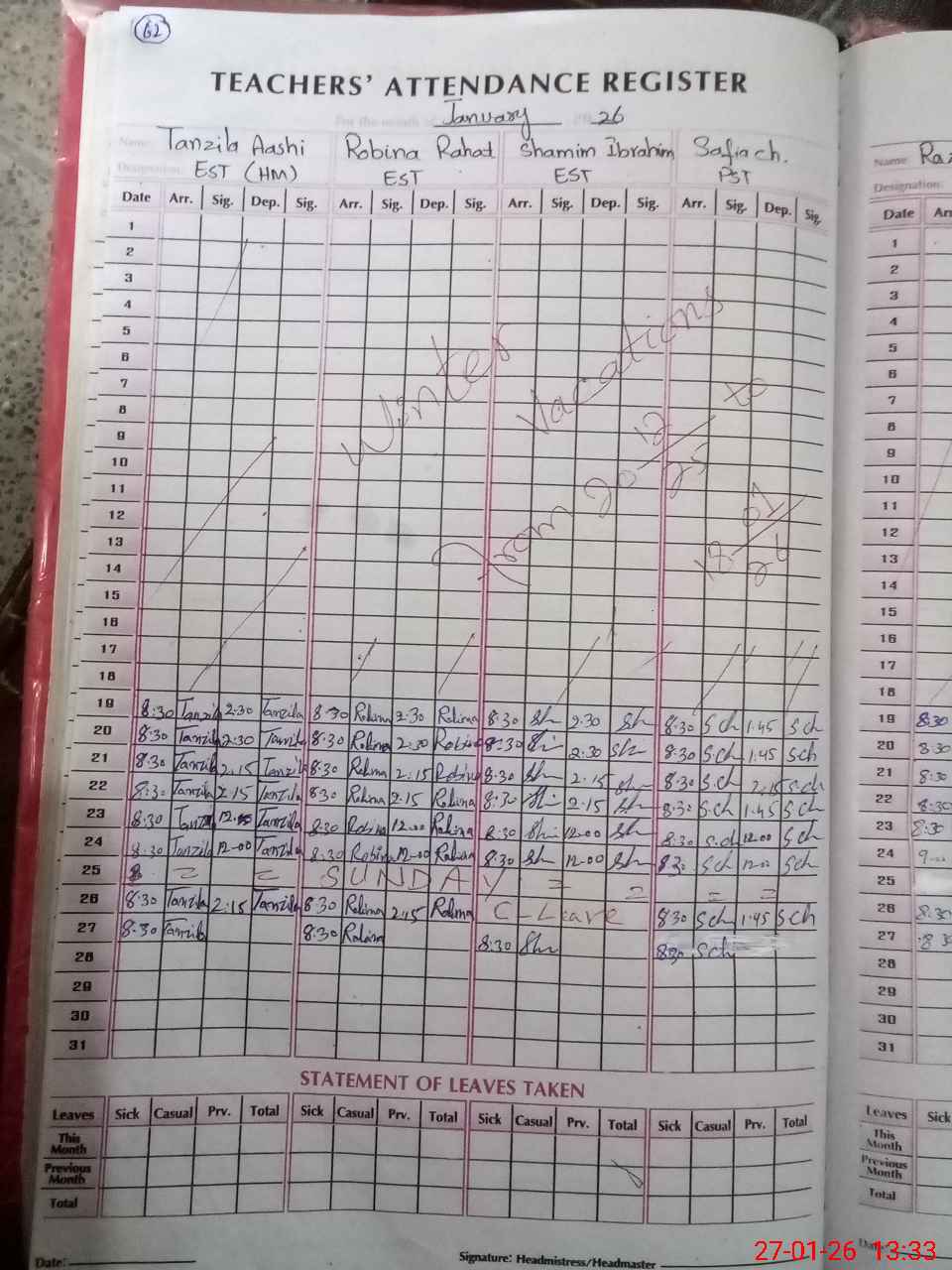 | Leave | Duty | Absent | Maternity | Medical | Ex- Pak |