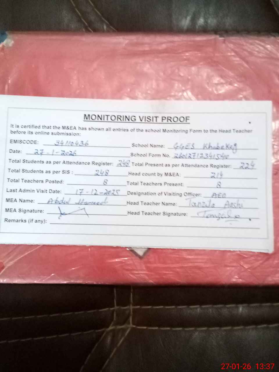 | Attendance Register | Head Teacher | MEA with School | Visit Proof |