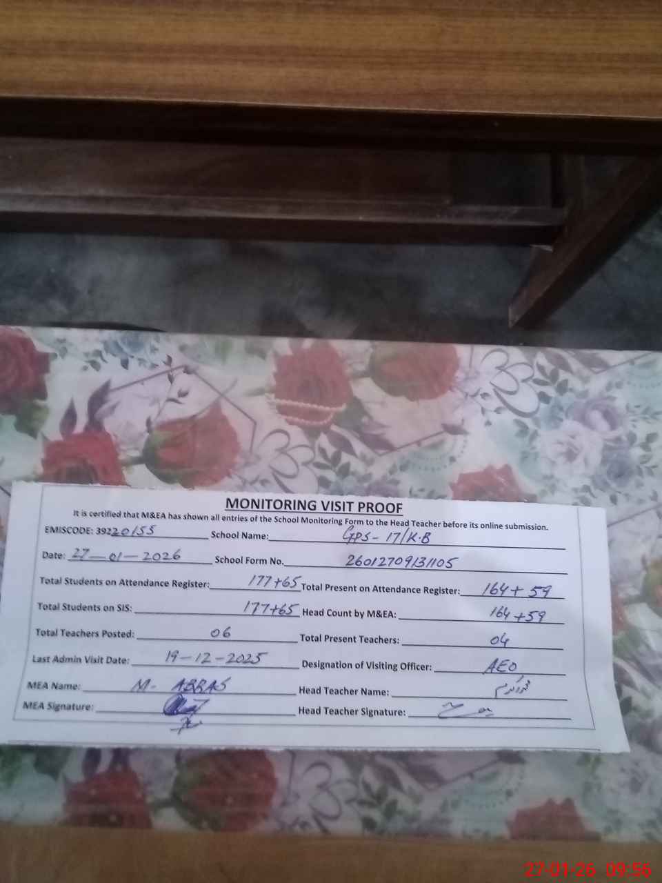 | EMIS Code: 39220155 | Name of School: GPS CHAK NO. 17 KB | |||