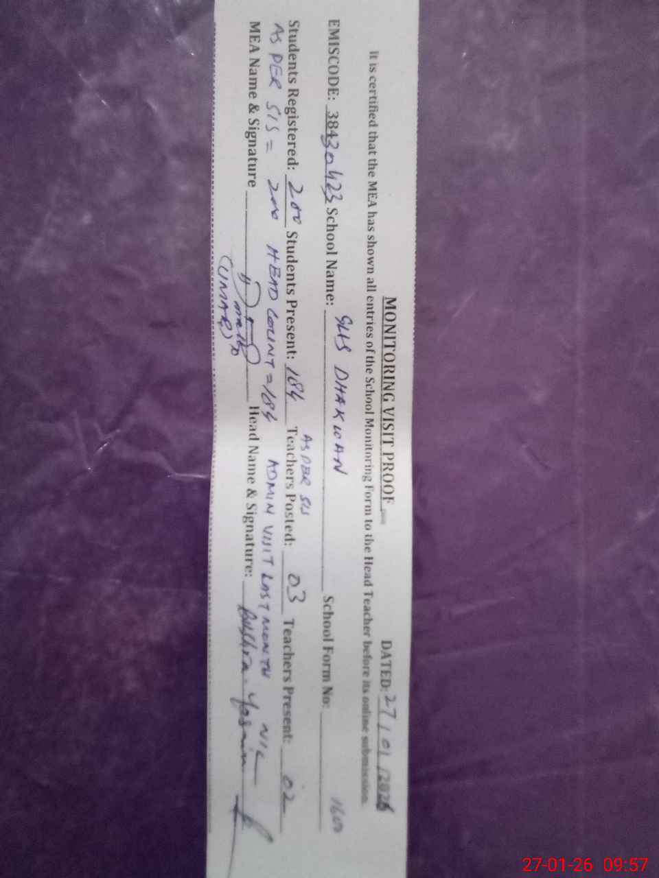| Attendance Register | Head Teacher | MEA with School | Visit Proof |