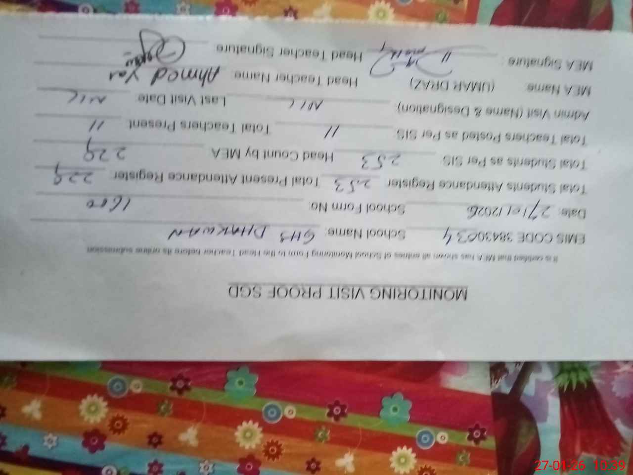 | Attendance Register | Head Teacher | MEA with School | Visit Proof |
