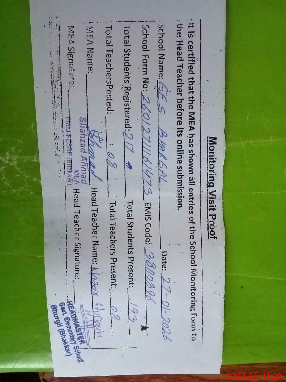 | Attendance Register | Head Teacher | MEA with School | Visit Proof |