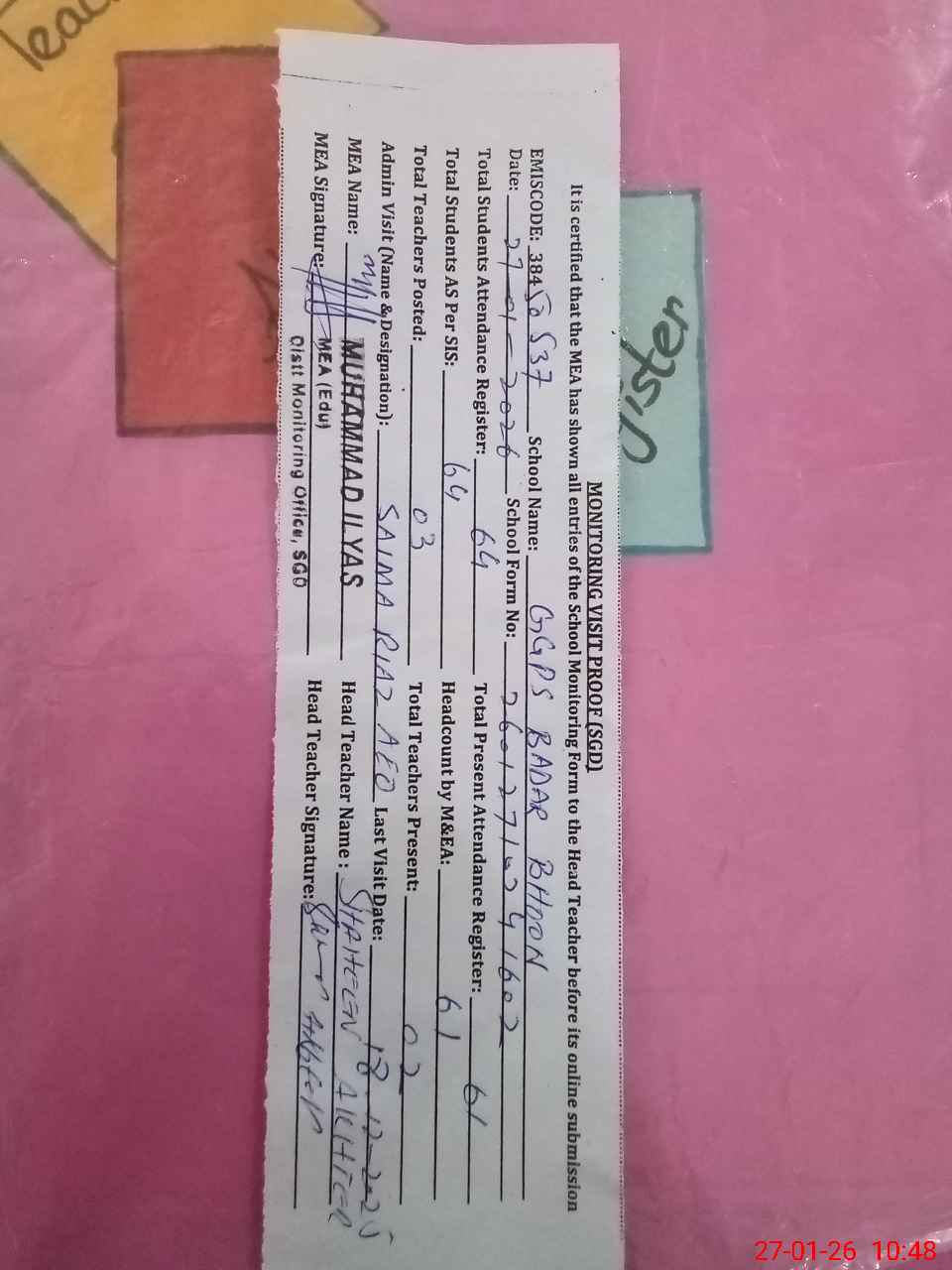 | Attendance Register | Head Teacher | MEA with School | Visit Proof |