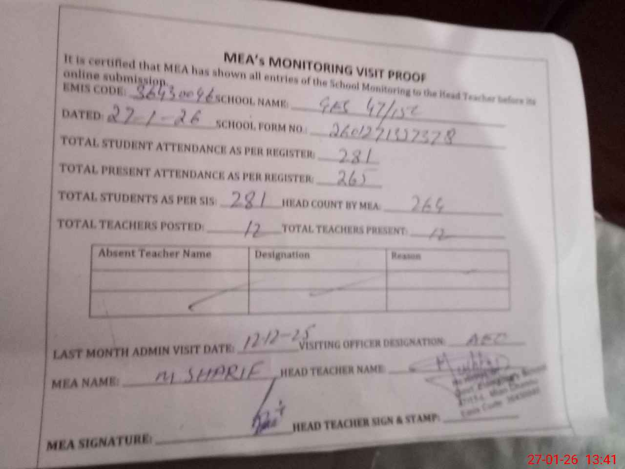 | Attendance Register | Head Teacher | MEA with School | Visit Proof |