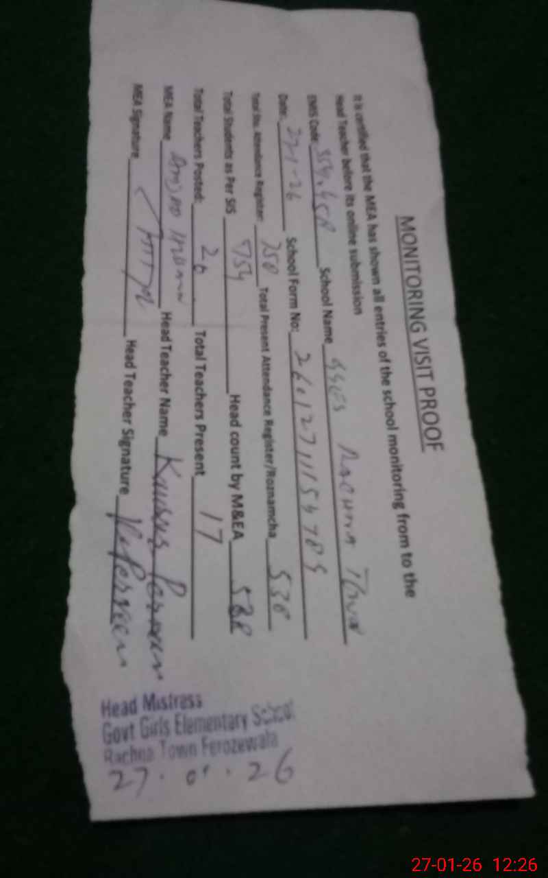 | Attendance Register | Head Teacher | MEA with School | Visit Proof |