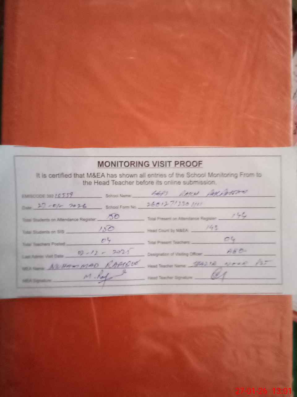 | Attendance Register | Head Teacher | MEA with School | Visit Proof |