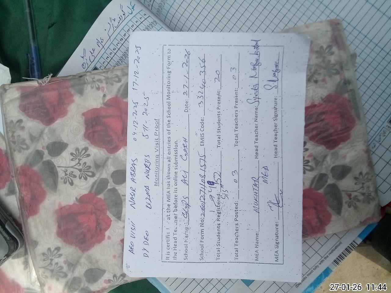 | Attendance Register | Head Teacher | MEA with School | Visit Proof |